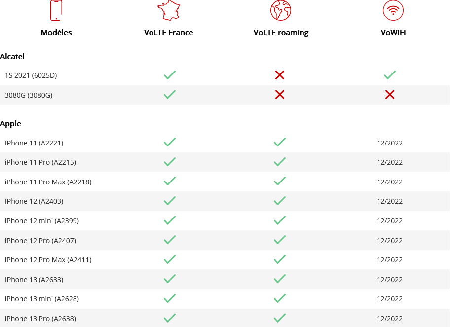 Parmi les nouveaux modèles compatibles VoLTE en France, on peut par exemple compter le Samsung A13 5G et plusieurs modèles de S21 FE 5G (selon les chipset et configurations techniques). Du côté de la VoWiFi, le Honor 50 et le S21 FE 5G sont désormais compatibles. Ces deux modèles sont également désormais compatibles avec la VoLTE en roaming à l’étranger, tout comme le Samsung Galaxy A13 5G. Vous pouvez vérifier vous même si vous y avez accès ou non sur la liste. Autre changement qui ne devrait pas ravir les amateurs d’Apple, la date de disponibilité de la VoWiFi pour les iPhone a été repoussée à décembre 2022, alors que son déploiement était autrefois prévu pour le troisième trimestre.