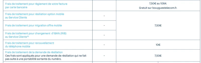 Ainsi, le règlement d’une facture mobile par carte bancaire est à présent payant en appelant la hotline, mais reste gratuit via internet. En revanche, la résiliation option mobile au service Clients, les migrations, ou encore le changement d’IBAN, sont aujourd’hui facturés 7,50€ sur tous les supports. Des frais sont également appliqués pour une demande de résiliation qui ne fait pas suite à une portabilité sortante du numéro.