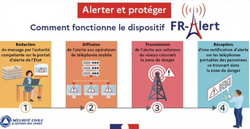 Concrètement, ce dispositif développé par l’Etat en collaboration avec les opérateurs, permet de prévenir en temps réel toute personne détentrice d’un téléphone portable de sa présence dans une zone de danger afin de l’informer des comportements à adopter pour se protéger. (tempête, inondation, terrorisme, épidémie, incident agro-alimentaire, accidents sur les réseaux de transports.