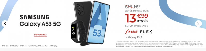 Dans le même temps, le smartphone de milieu de gamme Galaxy A53 5G bénéficie lui aussi de deux ODR, la première de 50€ est à activer via ce coupon. S’élevant à 10€, la seconde sera à valider sur votre Espace Abonné Free Mobile, une fois le smartphone reçu.