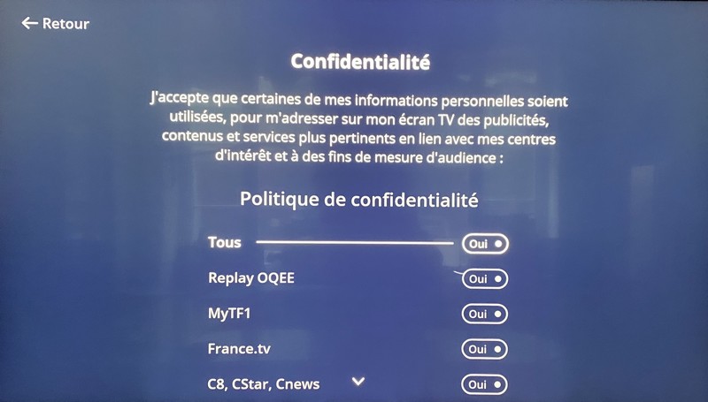 Dans la section “Légal”, vous trouverez le menu suivant : “Expérience personnalisée” et “Confidentialité”. L’interface OQee peut analyser les contenus que vous consultez pour affiner les recommandations de contenus. Il est possible de désactiver cette fonction en basculant le curseur en bas de l’écran dans la partie “Expérience personnalisée”. Les applications peuvent utiliser vos données personnelles pour vous proposer contenus et publicités de manière ciblée, mais également à des fins de mesure d’audience. Là encore, le curseur en bas d’écran permet de refuser. Il se trouve dans la partie “Confidentialité”.
