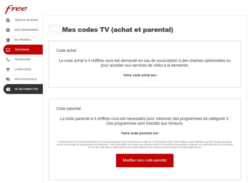 Dans l’espace abonné, il faudra simple cliquer sur le bouton rouge “Modifier mon code parental”, indiquer le nouveau sésame et valider.