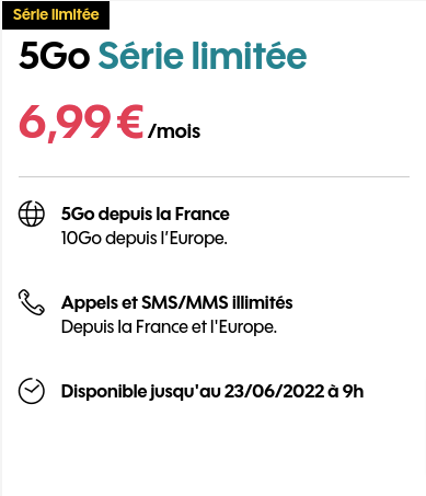 Pour rappel, un forfait 5 Go facturé 6,99 euros est également disponible sur le site de Sosh jusqu’à ce jeudi 23 juin. Pour ce prix vous profiterez des appels, SMS et MMS illimités ainsi que de 10 Go en roaming depuis l’Europe.