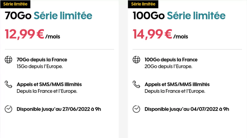 Sosh veut séduire pour cet été et propose des forfaits avec 70 Go ou 100 Go. Respectivement facturés 12,99 euros et 14,99 euros. Le forfait avec la plus petite enveloppe data est disponible jusqu’au 27 juin prochain 9h du matin alors que son grand frère jouera les prolongations jusqu’au 4 juillet 9h du matin également.