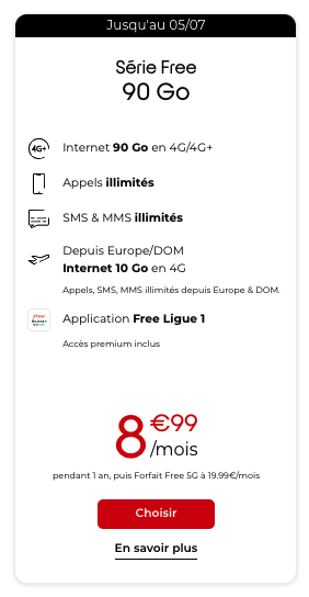 Free Mobile revoit aujourd’hui son offre Série Free en appliquant une baisse de tarif. Si l’opérateur propose toujours la même enveloppe de données, 90 Go à consommer en France métropolitaine, le prix de l’abonnement passe de 11,99€/mois à 8,99€. Par ailleurs, 10 Go sont inclus en roaming depuis l’Europe et les DOM. Au-delà de la première année, les abonnés basculeront automatiquement sur le forfait Free 5G 210 Go à 19.99€/mois. Le service Free Ligue 1 en accès premium est également inclus.