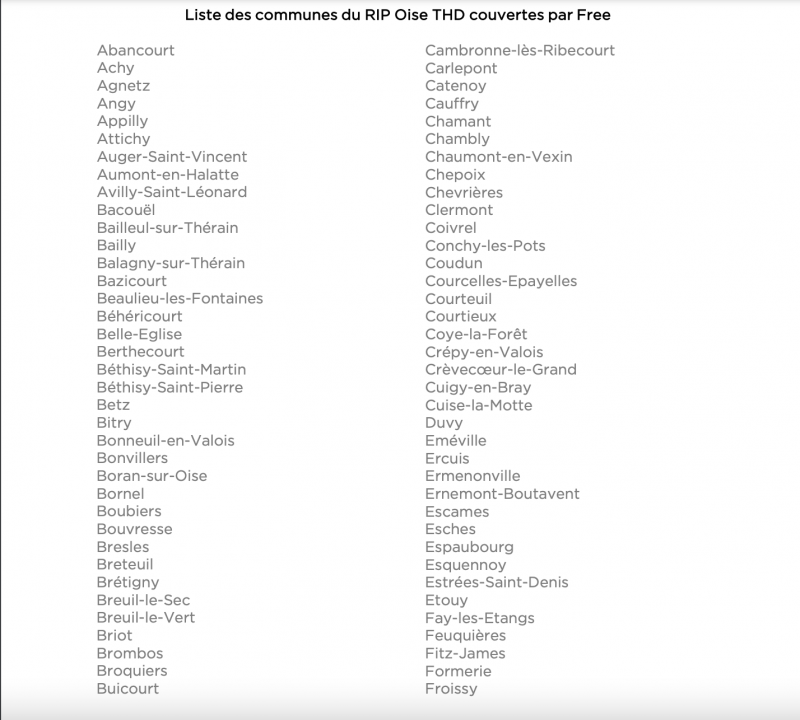 Free devrait être présent à la fin de l’été sur l’ensemble des prises déployées ce RIP. En zone privée, sur ce département, ses offres sont par ailleurs déjà disponibles sur l’ensemble des logements déployés dans les agglomérations de Compiègne, Creil et Beauvais, soit 122 000 logements. Sur le département de l’Oise, ce sont près de 400 000 logements qui seront éligibles dans les prochains mois.