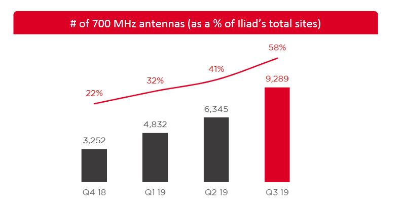 Lors de la présentation de ses résultats pour le troisième trimestre 2019, Iliad a indiqué la progression de son réseau mobile, mais aussi du déploiement de la bande 700MHz. Au troisième trimestre 2019, avec 9289 antennes actives fin septembre, la bande 700 MHz représentait 58% de l’ensemble des sites d’Iliad. Une augmentation très nette par rapport au trimestre précédent où l’opérateur de Xavier Niel n’avait que 41% de ses sites en 700MHz. Un bond de 17 points et de presque 3000 antennes activées en trois mois, sans commune mesure avec l’augmentation entre le premier et le deuxième trimestre (9 points et 1500 antennes activées).