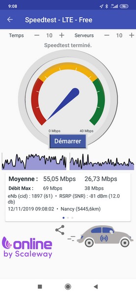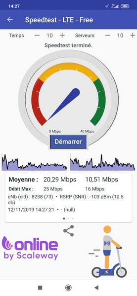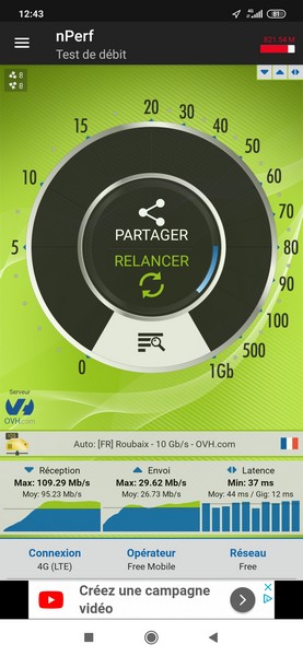 Nous avons mené nos tests de débits 4G sur le réseau de Free Mobile. Le Redmi Note 8 Pro n’a pas souvent franchi les 100 Mbit/s en réception (téléchargement).