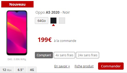 Le premier d’entre eux est le Oppo A5 2020. Proposé à 199 euros au comptant, il propose notamment un chipset Snapdragon 665 avec 3 Go de RAM, un écran IPS 6,5 pouces HD+, un quadruple capteur photo au dos et une batterie 5 000 mAh. Le tout orchestré par le système Android 9.0 Pie avec l’interface ColorOS 6.0.1.