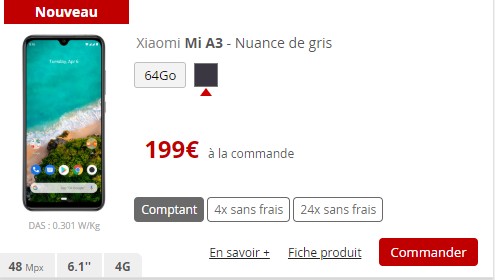 Le second est le Xiaomi Mi A3 qui s’affiche à 199 euros. Il s’agit d’ailleurs d’un retour puisque ce smartphone avait déjà été disponible chez Free Mobile. Côte caractéristiques, on a notamment un chipset Snapdragon 665 avec 4 Go de RAM, un écran AMOLED 6,1 pouces HD+, un capteur photo 48 Mégapixels et une batterie 4 030 mAh avec un support de la charge 18 Watts. On parle aussi d’un smartphone faisant partie du programme Android One, pour une interface proche de celle imaginée par Google. Rappelons également que la rédaction vous en avait proposé un test complet.