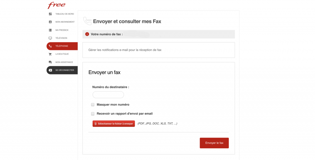 Après validation par mail, Free vous permettra d’accéder à l’interface toujours dans la même rubrique. Choisissez ou non (case à cocher) de masquer le numéro d’émission puis saisissez le numéro de votre destinataire. Décidez également de recevoir une notification de transmission par courriel. Reste à sélectionner le fichier à envoyer (PDF, DOC, TXT, XLS, JPG, PPT…). L’état d’envoi du Fax est indiqué dans la Liste des fax envoyés. Un autre onglet vous permet d’accéder aux fax reçus, ces derniers sont conservés pendant 1 semaine.