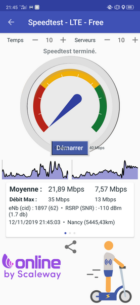 Nous avons mené des tests sur le réseau 4G de Free Mobile. Les débits obtenus étaient plutôt bons dans l’ensemble. Nous avons frôlé les 200 Mbit/s en réception en extérieur dans une zone bien couverte.