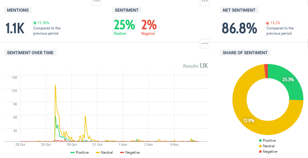 La nouvelle selon laquelle Free est le premier opérateur en France à lancer Amazon Prime, a collecté 1.1 K mentions pendant la période analysée (du 29 octobre au 3 novembre), dont la majorité le 29 octobre, le jour de l’annonce. Les internautes ont beaucoup partagé cette news sur Twitter (714 mentions), le post de la marque a lui-même généré 963 réactions, 815 commentaires et 287 partages sur Facebook. Les abonnés ont reçu avec enthousiasme la nouvelle en remerciant l’opérateur pour cette offre.