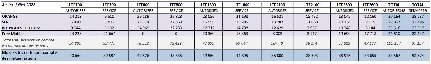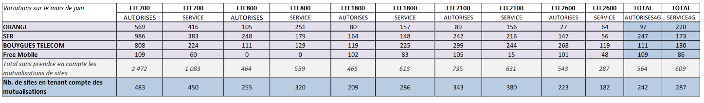 Le bilan des sites 4G mis en service en métropole s’établit comme suit :