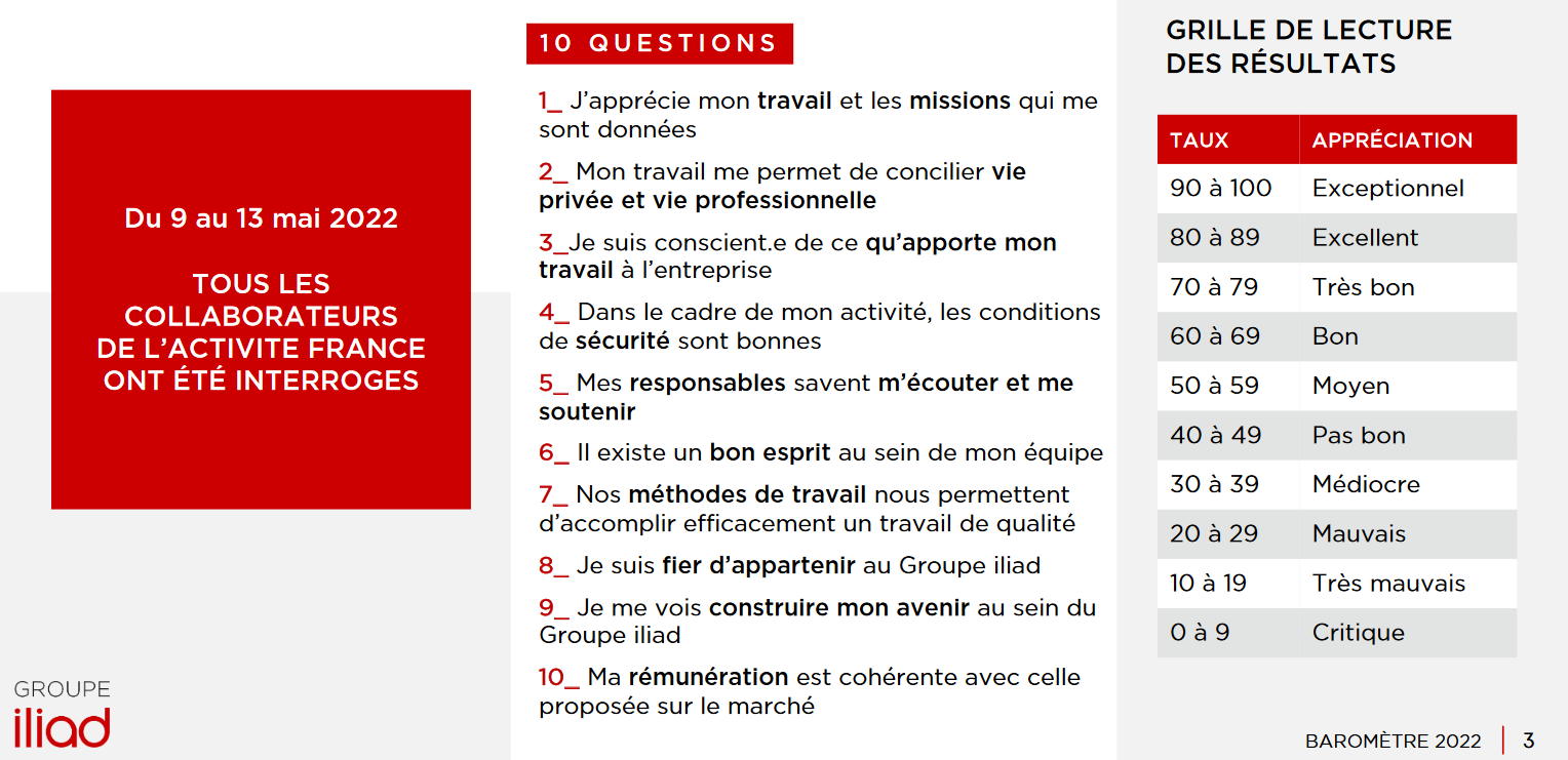 Travailler à Iliad semble être plutôt une bonne chose. Du 9 au 13 mai 2022, tous les collaborateurs du groupe Iliad en France ont été invités à répondre à une nouvelle enquête sur le climat social au sein de l’entreprise. 59% d’entre eux ont répondu aux 10 questions posées par leur employeur. Avec plus de 6000 participants et une hausse de 2 points, voici les résultats de cette étude.