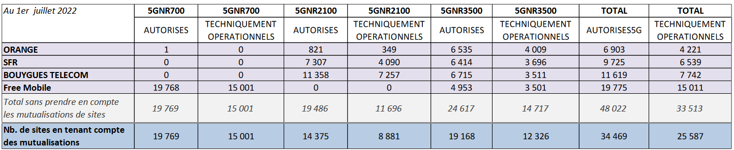 - 19 233 sites 5G sont autorisés dans la nouvelle bande 3,5 GHz (Bouygues Telecom, Free Mobile, Orange et SFR), dont 12 385 sont déclarés techniquement opérationnels.