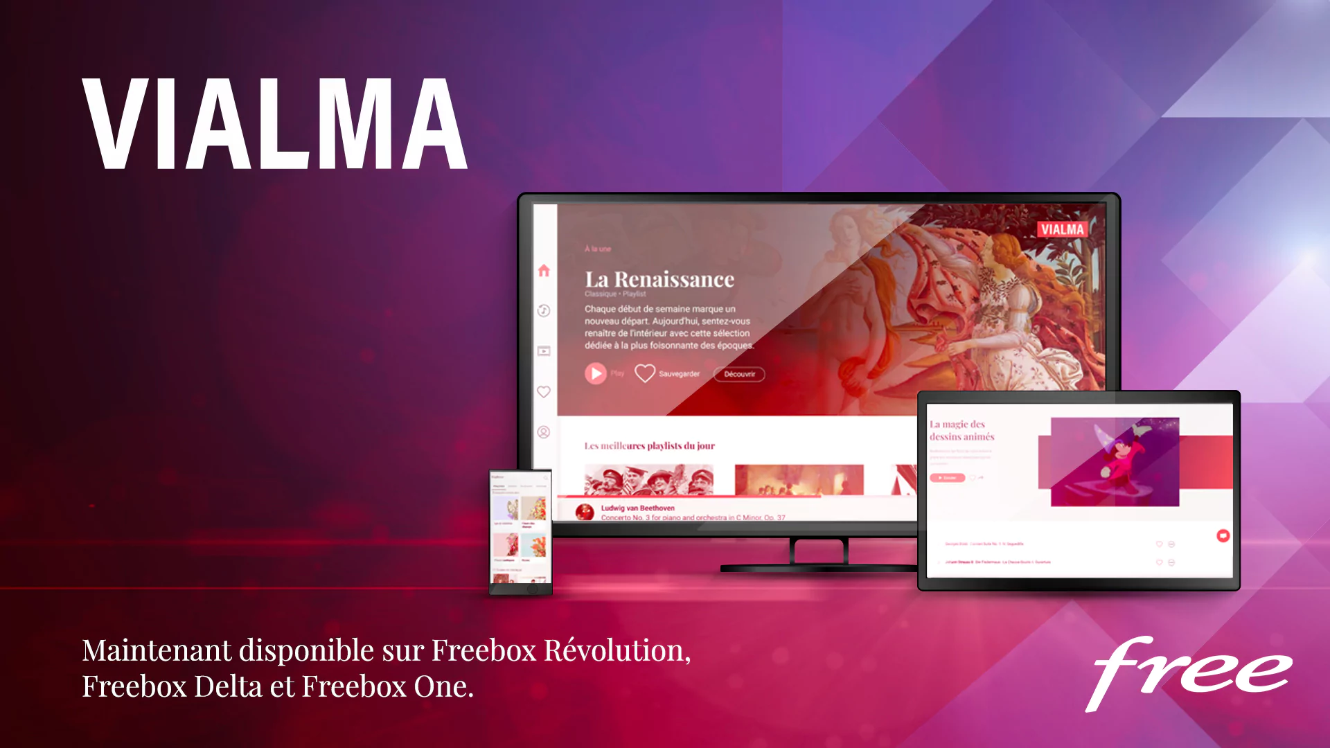 Vialma a été créé “parce que chaque moment mérite une belle musique” Quelle que soit votre humeur, Vialma accompagne votre quotidien à travers une large gamme de vidéos et de playlists thématiques élaborées par des experts passionnés. Que vous vous sentiez heureux, fatigués ou en recherche de la musique parfaite pour votre soirée, notre équipe a le programme parfait pour vous. Ce service est donc désormais disponible sur la Freebox avec un catalogue de vidéos HD et de titres audio en qualité CD.