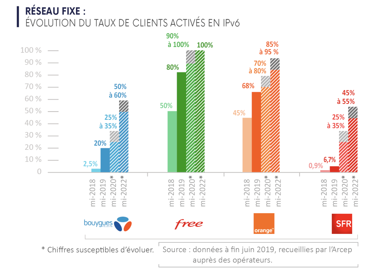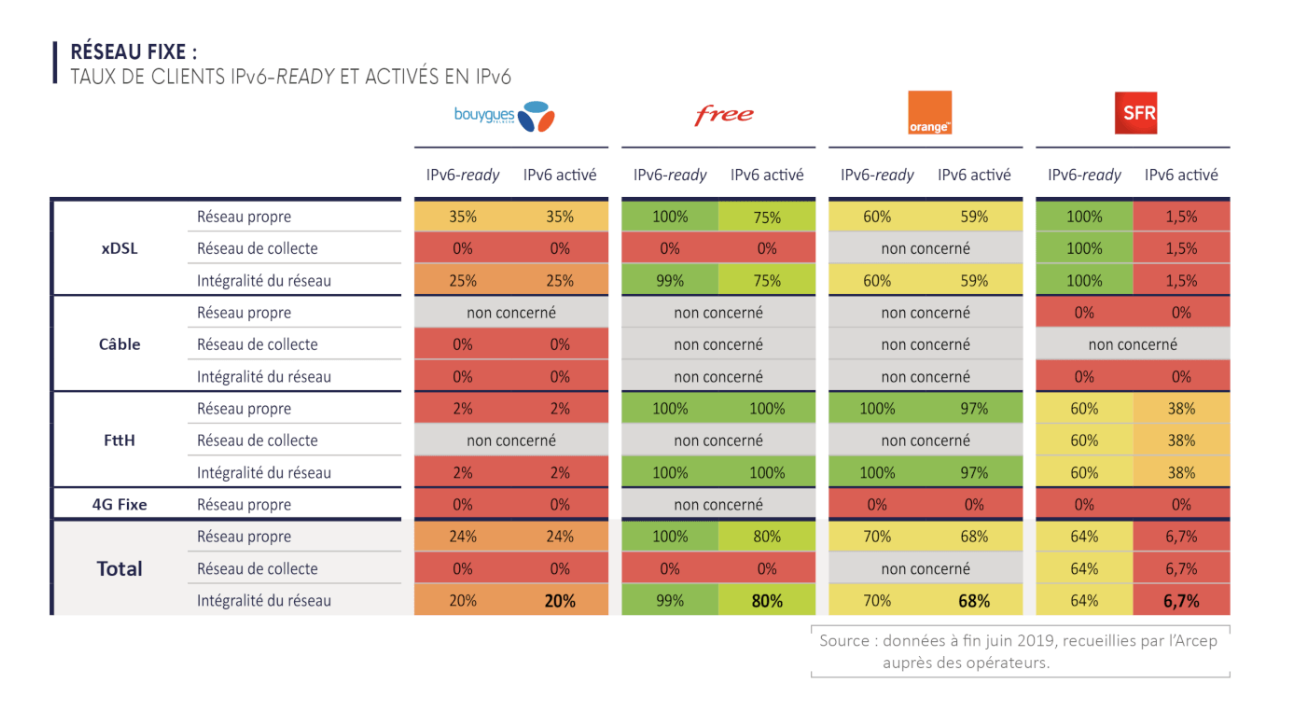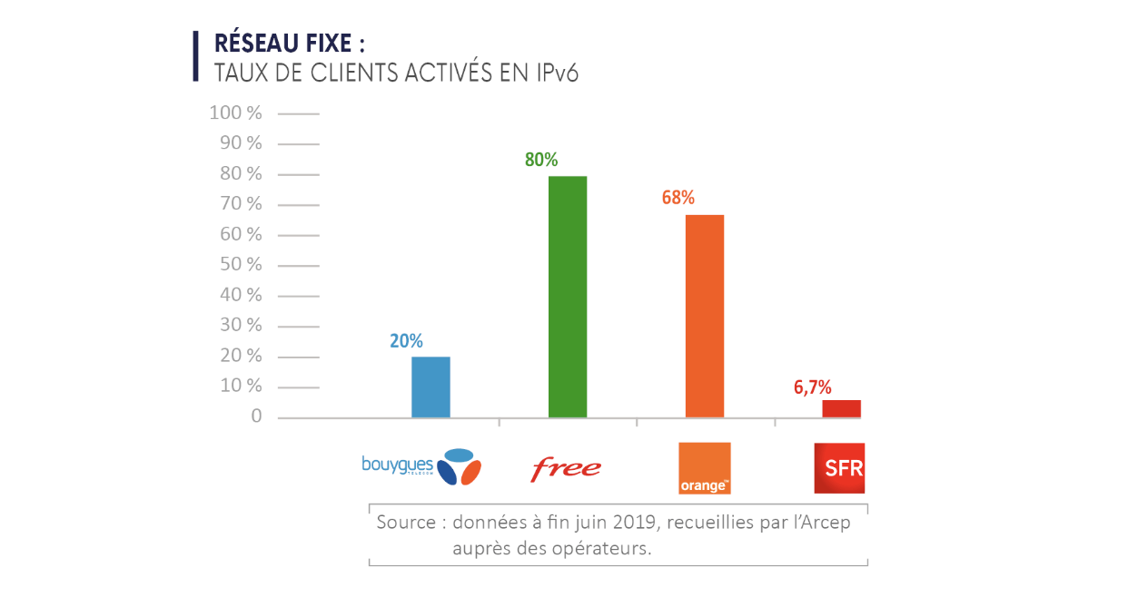 L’Arcep lève le voile sur son baromètre annuel de la transition vers IPv6 en France. La politique d’activation par défaut de Free sur les Freebox porte ses fruits avec 80% d’abonnés fixe ayant dores et déjà basculé mi-2019. Orange suit et reste ambitieux. Bouygues et SFR sont largués.