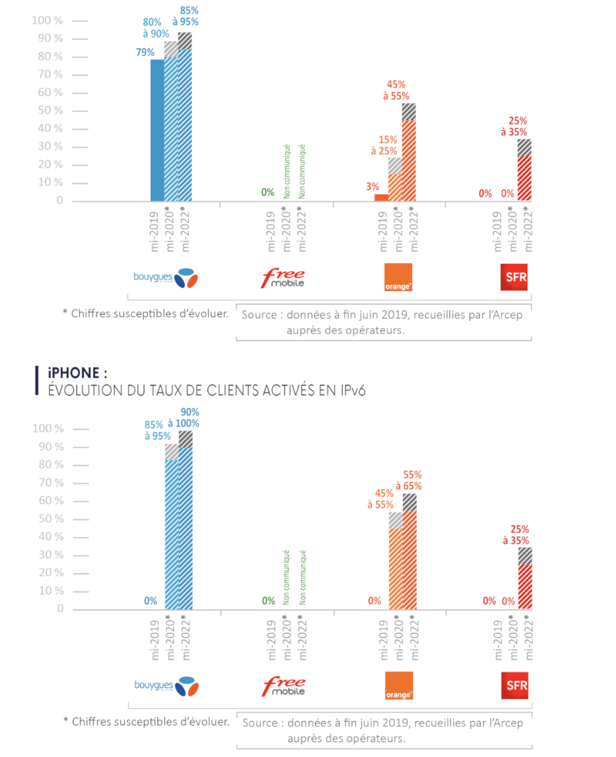 En particulier visé, SFR, très à la traîne. Si 100% de ses clients sont déjà compatibles IPv6 sur le xDSL, 60% en FttH et 0% sur le câble, quelques progrès sur l’activation en FttH sont toutefois à noter, même si le nombre de clients activés, c’est-à-dire qui émettent et reçoivent effectivement en IPv6, reste bien trop faible. Le régulateur estime aussi les prévisions de l’opérateur au carré rouge “insuffisantes” (entre 25% et 35% à mi-2020 et entre 45% et 55% à mi-2022). Une grande majorité des abonnés n’activent pas l’IPv6 manuellement, SFR est ainsi “encouragé à réaliser cette activation par défaut comme la plupart des opérateurs”.