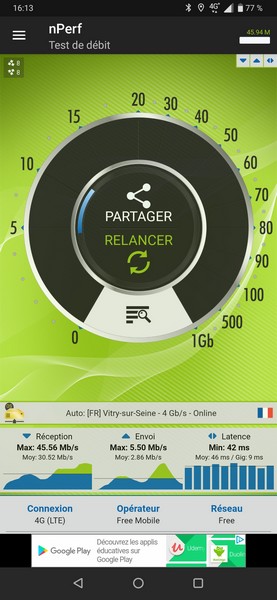 L’Asus Rog Phone II a été testé sur le réseau 4G de Free Mobile. Il franchissait régulièrement les 100 Mbit/s en réception en extérieur. Nous avons dépassé les 200 Mbit/s, dans une zone bien couverte :