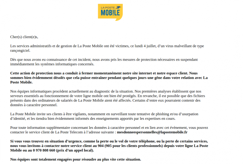 Comme il est précisé sur le message affiché lorsque l’on se rend sur le site : “Nos premières analyses établissent que nos serveurs essentiels au fonctionnement de votre ligne mobile ont bien été protégés. En revanche, il est possible que des fichiers présents dans des ordinateurs de salariés de La Poste Mobile aient été affectés. Certains d’entre eux pourraient contenir des données à caractère personnel”. Pour information les 1,8 millions d’abonnés de La Poste Mobile peuvent donc toujours utiliser leurs forfaits normalement seulement l’accès à leurs espace client peut s’avérer compliqué.