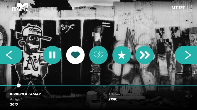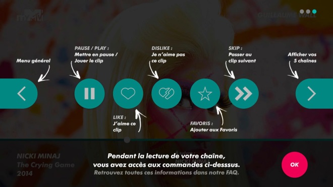 Lors de la lecture d’une chaîne personnalisée, il suffit d’appuyer sur la flèche du bas de votre télécommande afin d’accéder au lecteur. Ce dernier propose les options classiques « j’aime » et « je n’aime pas », mise en pause, ajout aux favoris, ainsi que la possibilité de passer au clip suivant. En appuyant sur la flèche de droite, l’utilisateur aura accès à ses cinq chaînes favorites. La flèche de gauche servira, elle, à consulter le menu principal.