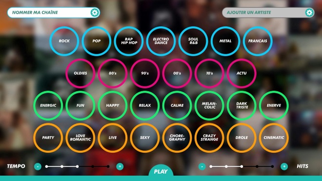 Une fois le didacticiel terminé, l’utilisateur atterrira dans le menu principal. Il est composé de plusieurs critères à la carte afin d’affiner ses préférences à savoir par genres musicaux, années, par visuels ou encore par artiste. En bas de l’écran, sont aussi présentés d’autres filtres permettant de paramétrer le rythme général des musiques sélectionnés ou encore le niveau de diffusion de « hits ». Et enfin en haut à gauche de l’écran est située une barre permettant de modifier le nom de sa playlist.
