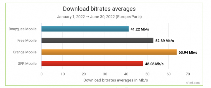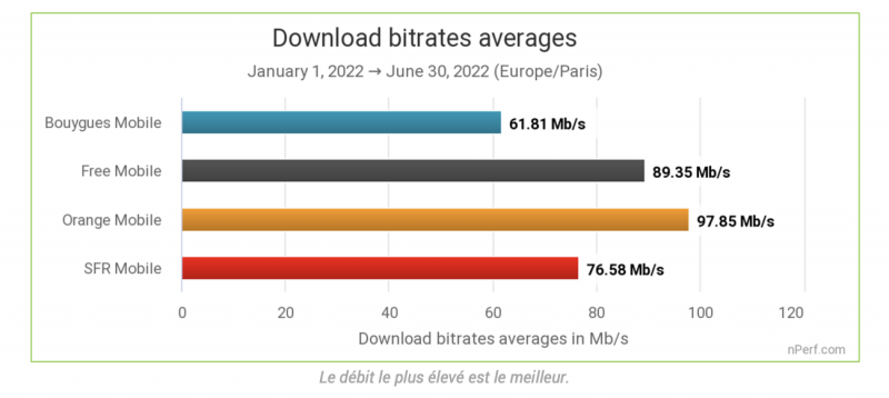 Depuis 5 ans et demi, Orange délivre la meilleure performance réseau française, en se classant premier sur les 6 indicateurs, à savoir le taux de réussite, les débits descendants et montants, le temps de réponse, la navigation, et le streaming vidéo sur Youtube même si les différences ne sont pas très importantes avec la concurrence. Sur les débits toutes technologies confondues, Orange a fourni le meilleur débit descendant moyen au cours du premier semestre 2022. Cette hausse est conséquente chez les quatre fournisseurs (+42% en moyenne), notamment pour Free et SFR, avec respectivement +29 Mb/s et +27 Mb/s. A ce jeu, l’opérateur historique devance Free, suivi de SFR et Bouygues.