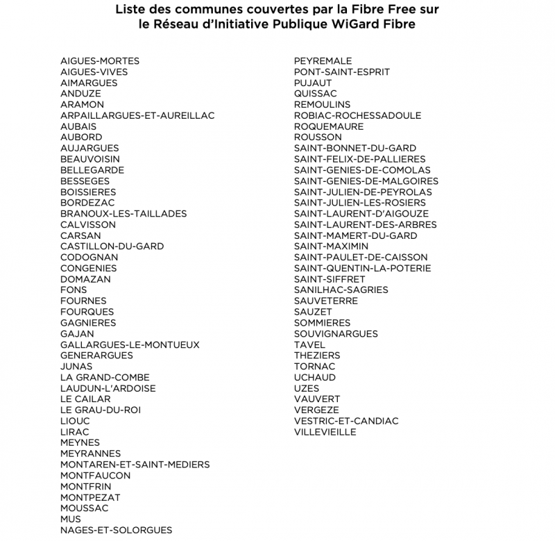 Si ce RIP couvre à date plus de 208 000 prises raccordables sur les 257 000 qu’il comptera d’ici fin 2022, Free propose aujourd’hui son offre Fibre à plus de 122 000 logements sur plus de 75 communes. A terme, Free l’opérateur sera présent sur l’ensemble des prises déployées. “En zone privée, sur le département, nous sommes par ailleurs déjà disponibles sur l’ensemble des logements déployés dans l’agglomération de Nîmes Métropole, les 16 communes de l’Agglomération d’Alès, de Bagnols-sur-Cèze ainsi que les 4 communes Gardoises du Grand Avignon (Rochefort du Gard, Saze, Les Angles et Villeneuve les Avignon), soit 180 000 logements”, indique Free.