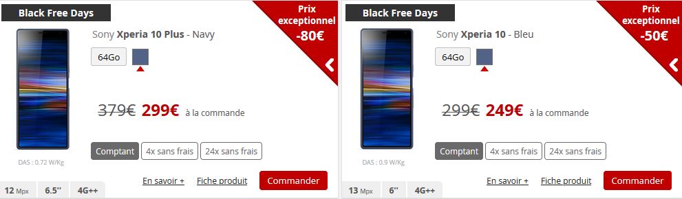 - Le Sony Xperia 10 Plus passe à 299€ au lieu de 379€, soit une réduction de 80€. Vous pouvez également le commander en 4 x sans frais, 77€ puis 3x 74€ et en 24x sans frais, pour 107€ puis 24 fois 8€ sans frais Vous pouvez retrouver notre test complet de ce modèle sur cet article.