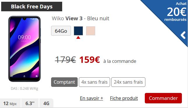- Le Wiko View 3 est proposé avec une offre de remboursement de 20€, couplé à une réduction de 20€ soit 159€ au lieu de 179€. Il est également proposé en 4 fois sans frais pour 42€ à la commande puis 3 fois 39€ sans frais. En 24 fois sans frais, il faudra compter 39€ puis 24 fois 5€. Vous pouvez retrouver le test complet du modèle dans cet article.