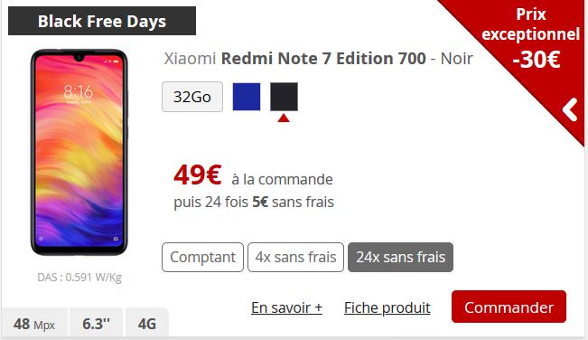 - Le Xiaomi Redmi Note 7 Edition 700 est proposé à 169€ au lieu de 199€, soit une réduction de 30€. En 4x sans frais, il faudra débourser 43€ puis 3 fois 42€ et en 24 fois sans frais, il faudra compter 49€ à la commande puis 24 fois 5€. Vous pouvez retrouver notre test complet de ce modèle sur cet article.