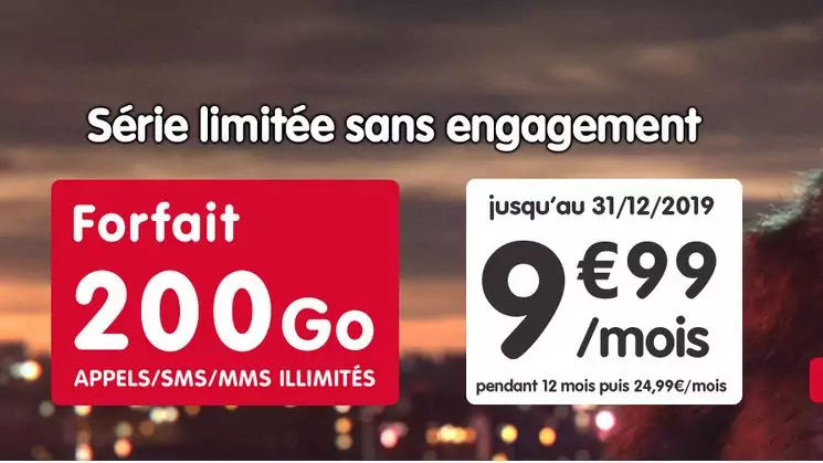 Un nouveau forfait est proposé par NRJ Mobile avec une promo pendant 12 mois, pour 200Go par mois. Il est proposé pour 9.99€ par mois pendant un an, puis retourne à son prix initial de 24.99€/mois. A noter que lors de la souscription, il faudra s’acquitter de 10€ à la commande pour la carte SIM. L’offre est valable jusqu’au 31 décembre 2019.