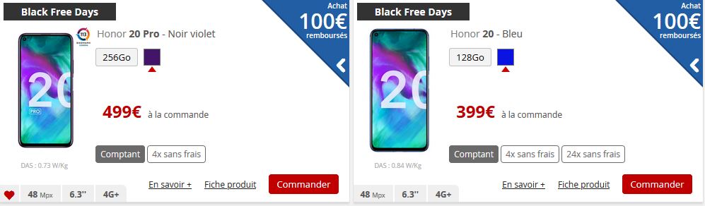 Le Honor 20 est proposé avec la même offre de remboursement de 100€. Il est possible de se le procurer dans la boutique Free Mobile pour 399€, ou d’opter pour le paiement en 4x sans frais avec 102€ à la première commande puis 3 fois 99€. Il est également possible d’opter pour le paiement en 24x sans frais, pour 207€ puis 24 fois 8€ sans frais.