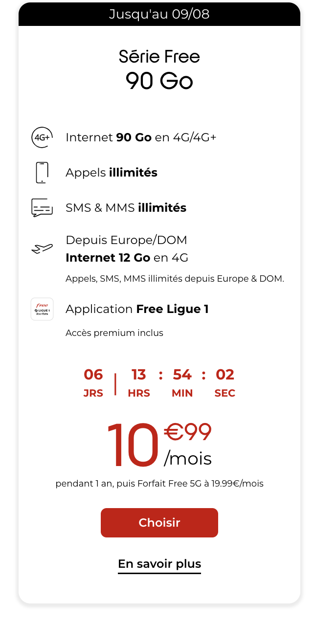 Dès aujourd’hui et jusqu’au 9 août prochain, Free Mobile propose une offre Série Free comprenant 90 Go à 10,99€/mois, soit 1€ de moins pour autant de data en France.