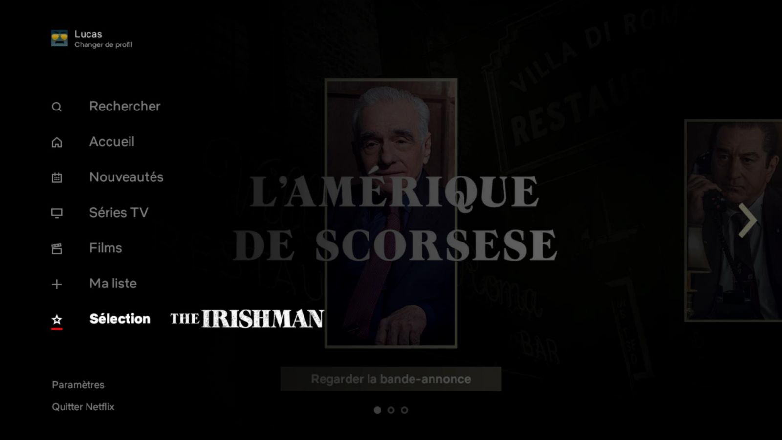 Notons également la présence d’une section “Séléction”, qui met en avant le programme phare de Netflix. En ce moment, c’est l’arrivée du prochain film de Martin Scorsese “The Irishman” qui est mis à l’honneur.