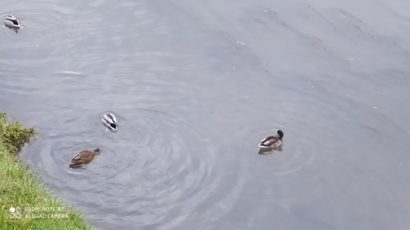 Une photo avec des canards en mouvement prise de loin, puis sa version zoomée :