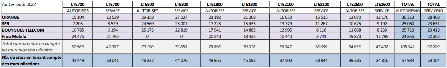 Le bilan des sites 4G mis en service en métropole s’établit comme suit :