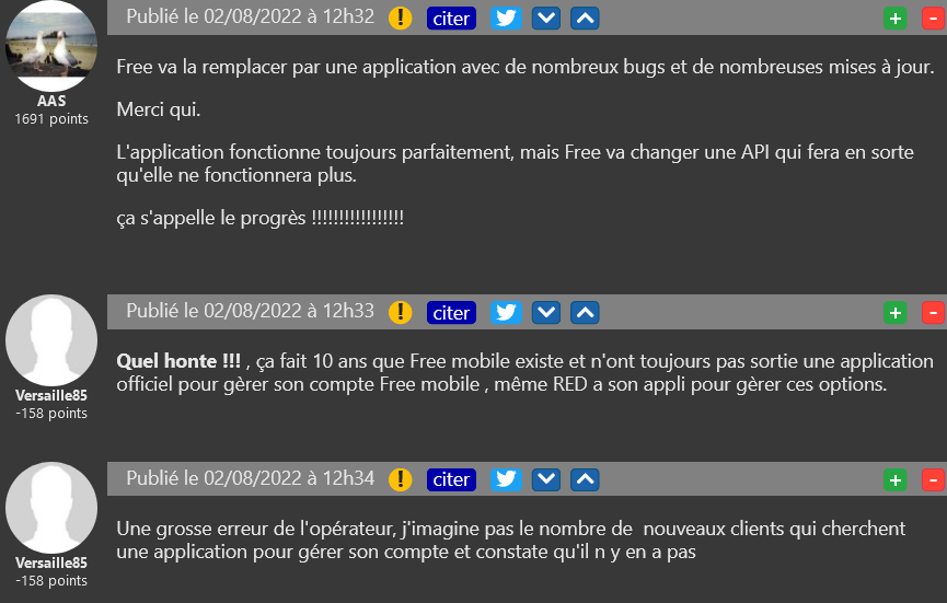 Un clap de fin brutal pour une application qui a su faire ses preuves et rendre service aux abonnés Free Mobile pendant de longues années. A défaut d’une app officielle développée par Free Mobile espérée depuis 10 ans bien que jamais promise, “Free Mobile – Mon Compte” se présente comme l’unique application permettant aux abonnés Free Mobile de suivre très facilement leur consommation d’appels, SMS, MMS et data sur iOS et Android, mais aussi d’accéder au hors-forfait et au détail des factures, à la messagerie visuelle ou encore aux cartes de zones de couverture de l’opérateur. Ce service a cependant fait ses adieux suite à la fin du contrat de sous-licence. Les abonnés redoublent alors de commentaires pour réclamer un remplacement par une appli développée directement par l’opérateur.