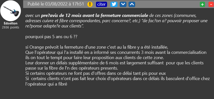 Dans une réponse apportée dans le cadre d’une consultation publique lancée en début d’année par l’Arcep sur le projet d’extinction du réseau cuivre d’Orange, les concurrents dont SFR multiplient les propositions. L’opérateur souhaite une vraie transparence et un accompagnement digne de ce nom pour ne pas laisser des clients sur le carreau. Et ils ne sont pas les seuls à apporter leurs contributions, nos lecteurs aussi donnent leurs avis dont Edsetton qui considère qu’Orange est encore trop lent.