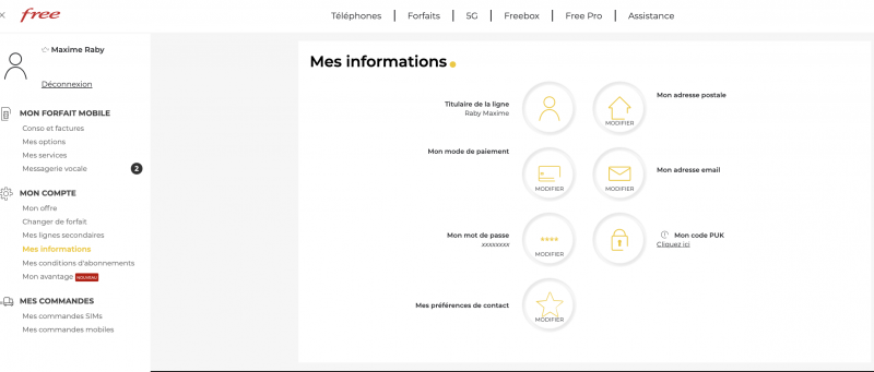 Pour la troisième solution, il faut passer par l’espace abonné Free Mobile accessible à l’adresse https://mobile.free.fr/. Une fois connectés avec vos identifiants, allez dans “Mon compte”, puis “Mes informations”. De là, cliquez sur “mon code PUK”. Celui-ci s’affichera directement, composé alors de huit chiffres.