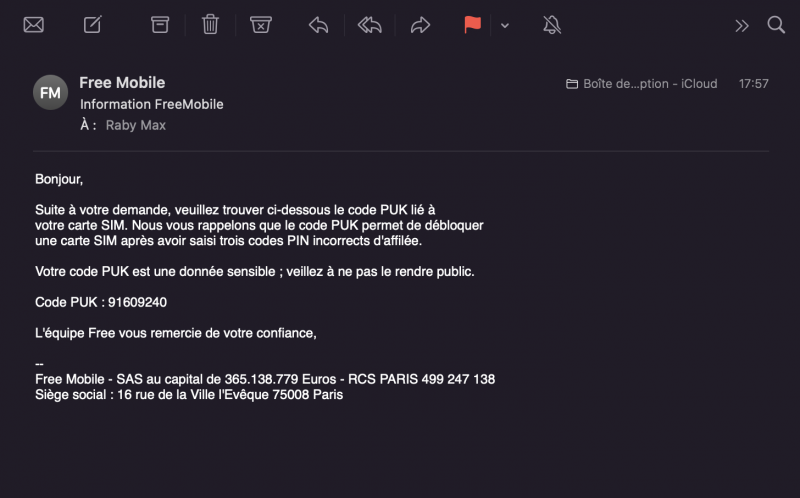 En parallèle, un e-mail vous est envoyé sur votre adresse e-mail de contact avec ce même code PUK. La réception se fait quasi instantanément. Pas d’attente donc.