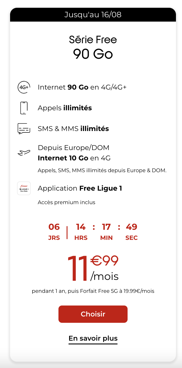 Dès aujourd’hui et jusqu’au 16 août prochain, Free Mobile propose une offre Série Free comprenant 90 Go à 11,99€/mois, soit 1€ de plus pour autant de data en France.