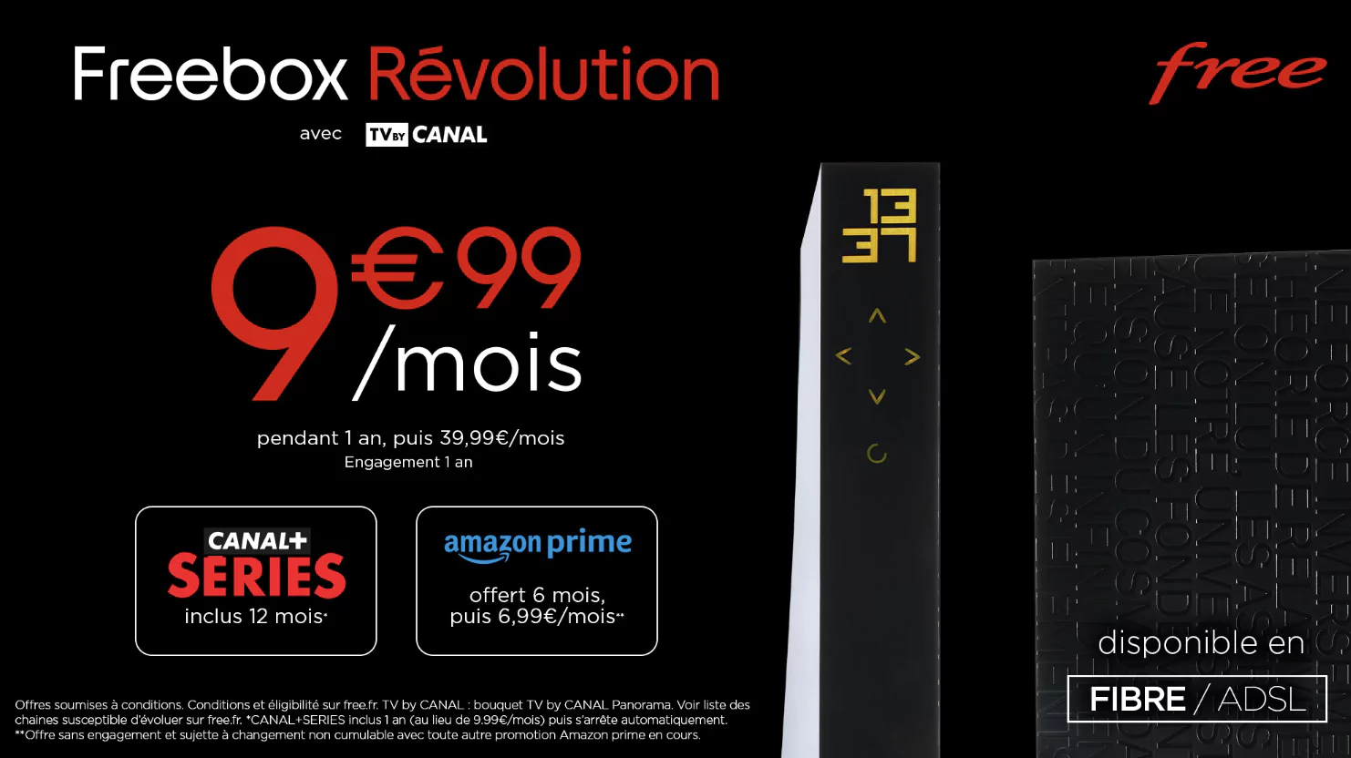 Jusqu’au 24 août prochain, le forfait Freebox Révolution avec TV by CANAL est proposé à 9,99€/mois pendant 1 an (dans la limite de 12 mensualités au tarif promotionnel), puis 39,99€/mois. Le service SVOD Canal+Séries est offert pendant 1 an et Amazon Prime pendant 6 mois.