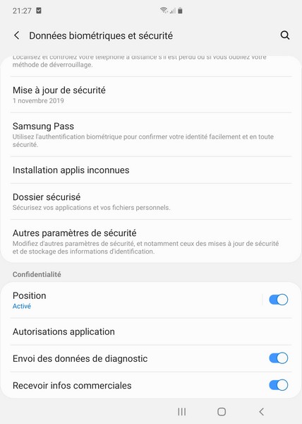 Durant nos tests, nous avions les patchs de sécurité du mois de novembre 2019. En parlant de sécurité, il y a la reconnaissance faciale qui marche très bien, notamment lors de l’ouverture du Galaxy Fold. Le lecteur d’empreintes digitales sur la tranche droite, en dessous du bouton d’allumage/mise en veille répond bien également.