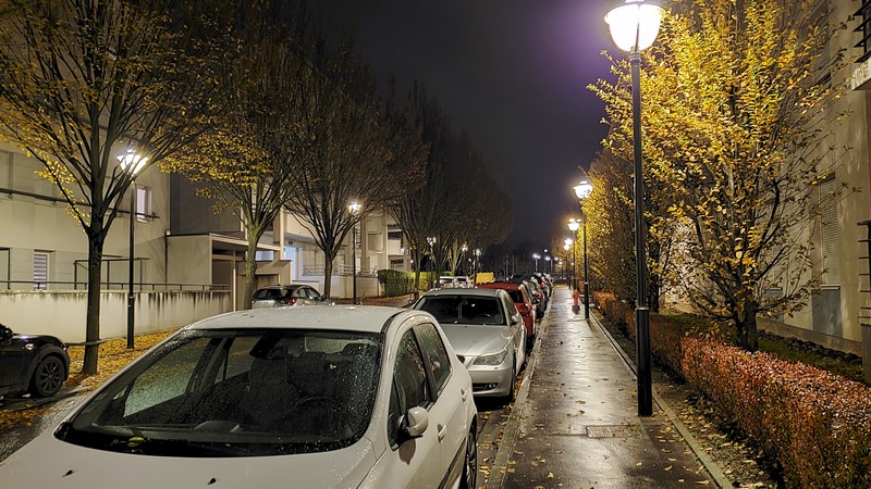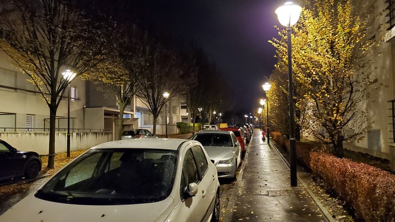 Une photo le soir en milieu urbain, puis sa version corrigée par le mode nuit :