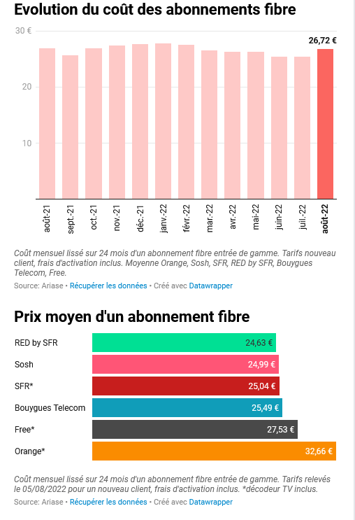 L’étude s’est notamment penchée, pour l’internet fixe, sur les abonnements fibre entrée de gamme. En incluant les frais d’activation et en observant les prix lors des promotions la première année et avec le prix final la deuxième, le coût moyen d’une box fibre entrée de gamme sur 24 mois est de 26.72€/mois en août 2022 contre 25.42€ en juillet dernier. Ce coût mensuel est en baisse de 0.6% sur un an, avec des prix particulièrement plus bas durant la période allant de février à juillet 2022. L’évolution a surtout été notable chez Red, Sosh et SFR, avec une hausse comprise entre 2 et 4€ par rapport au mois dernier.