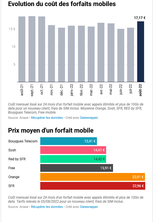 Du côté du mobile, le spectre plus large de l’étude met en avant certaines différences d’approche. Ariase a en effet analysé l’ensemble des forfaits proposant les appels et SMS illimités ainsi que plus de 10 Go d’internet mobile. En moyenne, toujours en prenant en compte les 24 premiers mois de l’abonnement et en incluant le coût des cartes SIM, un forfait mobile atteint alors 17.17€/mois. S’il est toujours en forte baisse par rapport à l’année dernière (8%), ce prix moyen remonte de plus de 2€ au cours des deux derniers mois.