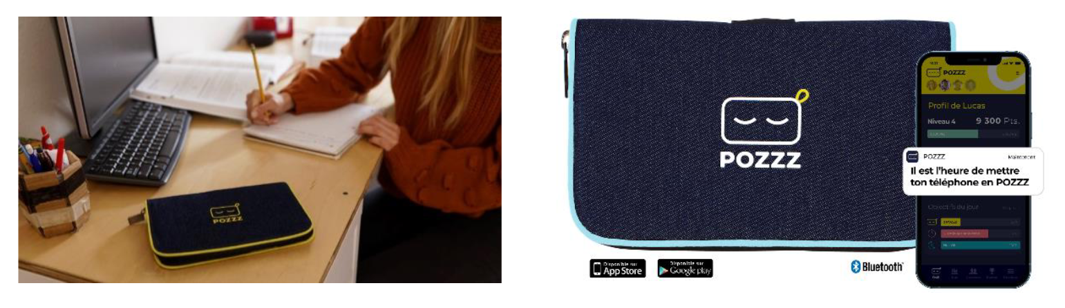 Cet accessoire, développé par la la start-up Bordelaise POZZZ, est une pochette somme toute assez simple destinée aux smartphones d’une valeur initiale de 49.90€. Le principe est le suivant : l’adolescent glisse son téléphone à l’intérieur et ferme le zip intelligent, déclenchant ainsi une pause. La pochette connectée détecte l’appareil via le Bluetooth et comptabilise le temps passé par le smartphone en son sein.