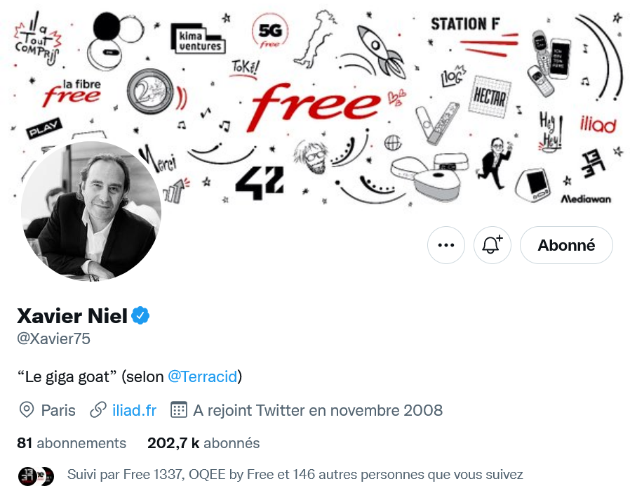 Terracid a donc félicité la réactivité de Xavier Niel et des équipes de Free bien sûr, le qualifiant de “giga GOAT” (“Greatest Of All Times”, ou meilleur de tous les temps). Il semble que Xavier Niel ait été plutôt flatté du compliment et a décidé de le montrer au monde, ou du moins à Twitter. En effet, le chef d’entreprise ayant créé Iliad, l’école 42, soutenu de nombreuses entreprises affiche désormais ce badge d’honneur en tant qu’unique caractéristique de présentation sur le réseau social.